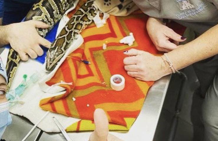 L’esemplare è stato trasportato nel centro veterinario più vicino, dove è stato sottoposto a un intervento delicato, ma seppur non chirurgico identificato come d’estrema urgenza. Il personale della “Clinica Veterinaria San Minianimal“, in provincia di Pisa, ha fatto tutto il possibile per far rinsavire il pitone.