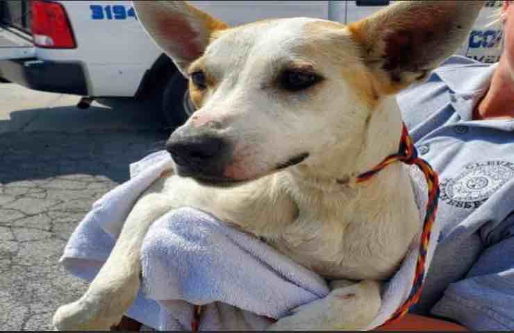 La donna ha avvertito immediatamente l’agente che aveva visto lungo la strada, ed arrivati entrambi sul posto, hanno trovato il cane ferito e spaventato. L’animale era molto provato ed era in procinto di perdere i sensi, è per questa ragione che i due si sono procurati acqua e cibo per il cane. L’animale dopo un iniziale reticenza si è lasciato avvicinare.