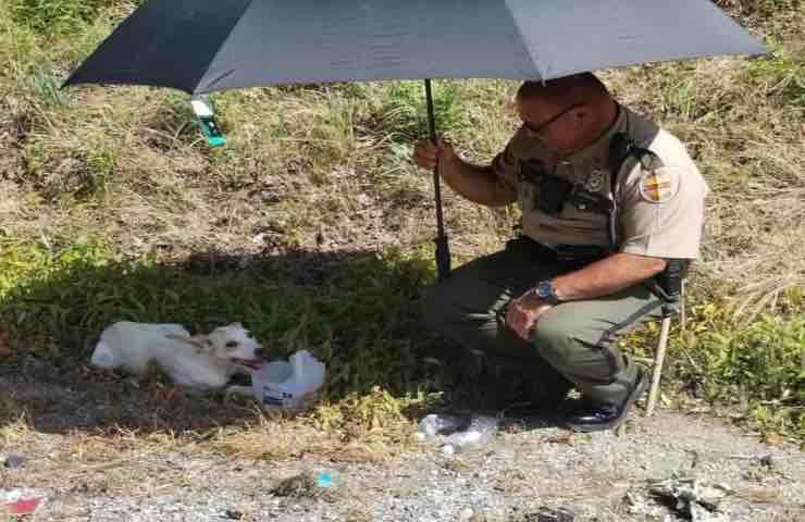 Ha mangiato e bevuto era molto affamato e soprattutto aveva sete, nel frattempo è stata sollecitata anche l’Animal Control. Mentre aspettavano i soccorsi, l’agente ha fatto un gesto commovente, aperto un ombrello per riparare il cane dal sole e proteggerlo dal forte caldo, si è seduto accanto a lui e non l’ha lasciato solo nemmeno per un minuto.
