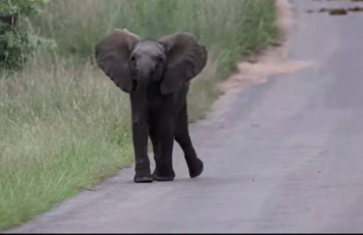 Nel Kruger National Park vive una comunità di elefanti di 13.050 esemplari fra maschi e femmine. Animali di indole pacifica, gli elefanti solo quando si sentono minacciati mettono in atto una strategia difensiva che consiste nel prendere la rincorsa e “caricare” per intimorire l’avversario. Questa pratica viene insegnata anche ai cuccioli, che spesso si esercitano quando giocano con i loro coetanei. Il piccolo elefante protagonista del video su YouTube, rimasto poco lontano dal branco sulla strada asfaltata, ha messo in pratica gli insegnamenti e ha fatto del suo meglio per prendere più volte la rincorsa.