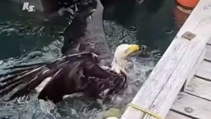 Nei giorni scorsi, in Canada, un meraviglioso esemplare di aquila calva è caduto in mare in prossimità di un molo. Un uomo ha notato l’accaduto e apprendendo che l’animale si trovava in estrema difficoltà ha deciso di avvicinarsi per provare ad aiutarlo a tornare in superficie. Dopo vani tentativi dell’aquila di divincolarsi dalla pressione dell’acqua l’uomo ha trovato un modo per aiutarla senza farla spaventare.