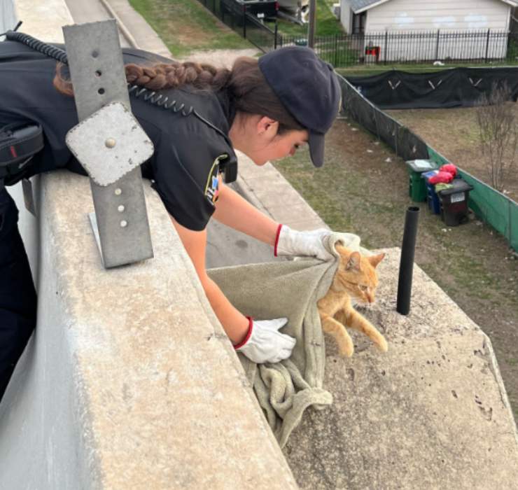 All’inizio il gatto si è mostrato diffidente nei confronti dei nuovi arrivati, poco dopo però ha permesso loro di prenderlo in braccio. L’agente Flores ha così recuperato il felino, mettendolo al sicuro.