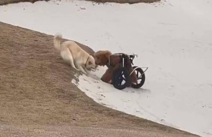 La passeggiata tranquilla dei due cagnolini sulla spiaggia si è infatti dimostrata più difficile del solito quando il pelosetto costretto in sedia a rotelle è finito in una duna di sabbia del campo non riuscendo più a tirarsi fuori da solo. Non avrebbe di certo potuto risolvere la situazione senza l’aiuto del suo amico a 4 zampe che senza pensarci su nemmeno un minuto lo ha afferrato e tirato fuori dalla situazione.