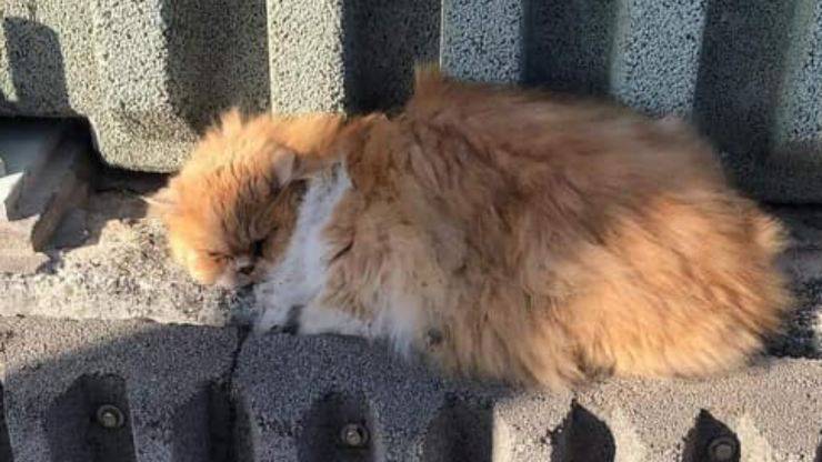 Il gatto Grisù fermo sul muretto della stazione di Pescara: ritrovato da un abitante del posto