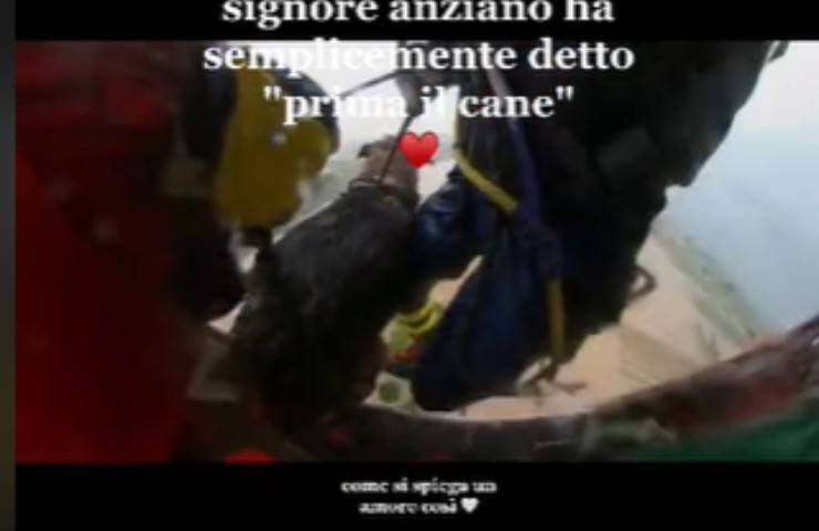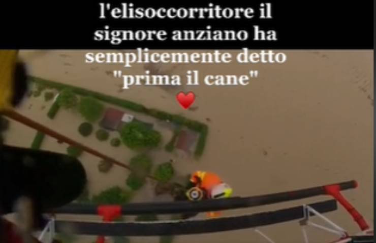 Come spiega la didascalia posta a corredo delle immagini, l’uomo era rimasto bloccato insieme al suo cane in mezzo all’alluvione e si era rifugiato sul tetto dell’automobile: «Non so di preciso quante ore siano rimasti abbracciati sul tetto di quell’auto ma sta di fatto che quando è arrivato l’elisoccorritore il signore anziano ha semplicemente detto: “prima il cane”».