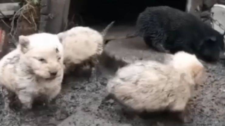 In un villaggio nel distretto di Shatursky, situato a 300 km da Mosca, sono stati trovati vicino ad una stalla sfasciata dei cuccioli intrappolati nel fango e insieme a loro c’era anche la loro mamma legata al guinzaglio. La cagnolina era ridotta in condizioni terribili: denutrita al punto che era ridotta a pelle e ossa. Accanto a loro non c’era nessuna traccia d’acqua, intorno c’era solo terra e tanto fango. Hanno vissuto in queste condizioni, senza cibo, per molti giorni, costretti a cibarsi del fango che li circondava.