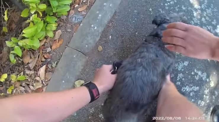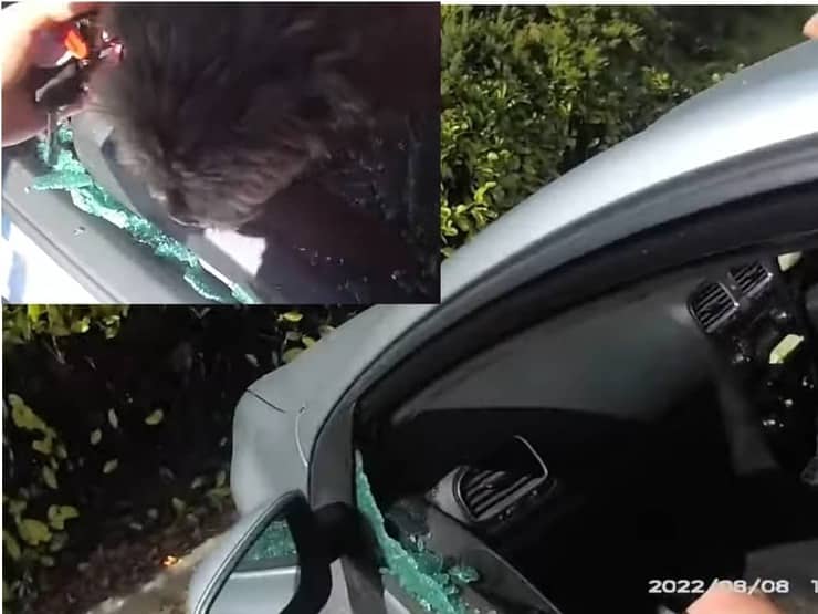 Da quello che si evince della body-cam della polizia, gli agenti non hanno esitato un solo secondo, e arrivati sul luogo hanno sfondato il finestrino della macchina aprendola e occupandosi immediatamente del povero cucciolo ansimante, che vedendo una via d’uscita e la salvezza si è gettato tra le braccia del poliziotto che è corso vicino ad una siepe dove c’era un minimo d’ombra, mentre la sua collega con una bottiglia d’acqua ha rinfrescato il cucciolo gettandogli un po’ di liquido sul collo per poi farlo bere .