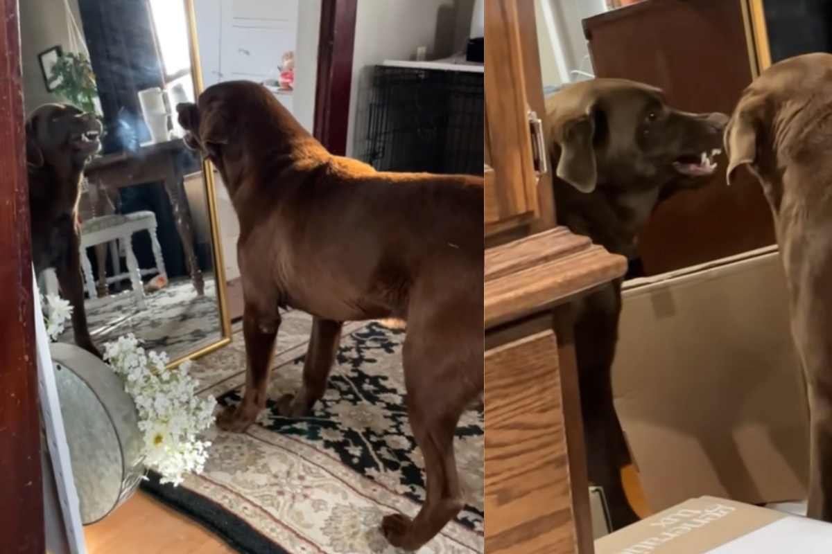 Sconforto, preoccupazione e paura possono essere i sentimenti più comuni quando in casa propria ci si trova improvvisamente di fronte a un perfetto sconosciuto. Lo sa bene il povero Ruger, un cane di razza Labrador Retriever dal manto color cioccolato. Il quattro zampe, sempre estremamente tranquillo e ben disposto nei confronti degli altri esseri viventi, nel vedere un cane nel salotto della cucina che lo “fissava” e ne ripeteva ogni movimento non ha potuto fare a meno di ringhiare spaventato e arrabbiato. Peccato, però, che si trattava solo della sua immagine riflessa in uno specchio. La reazione del quattro zampe ha divertito migliaia di persone.