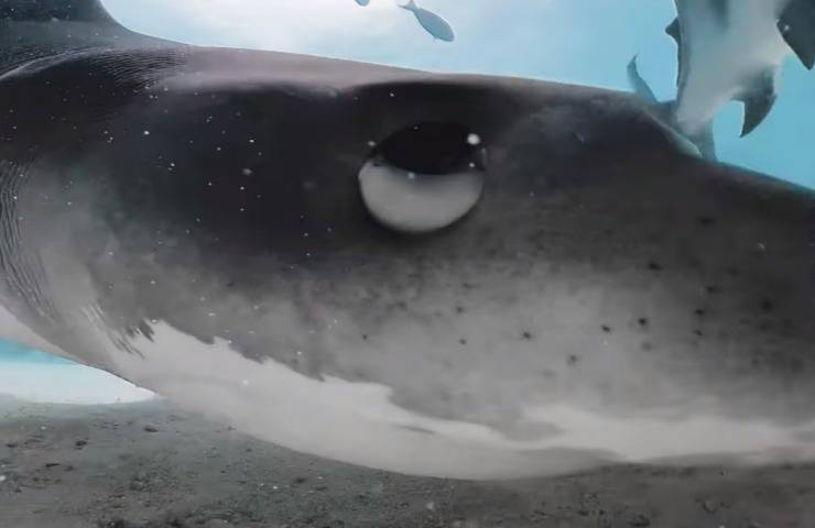 Lo squalo tigre in video viene ripreso dalla telecamera subacquea stessa: le impressionanti immagini hanno fatto il giro del mondo