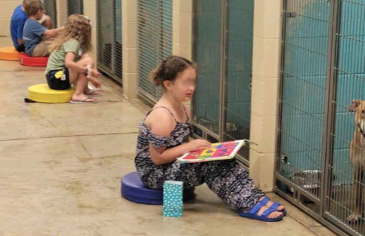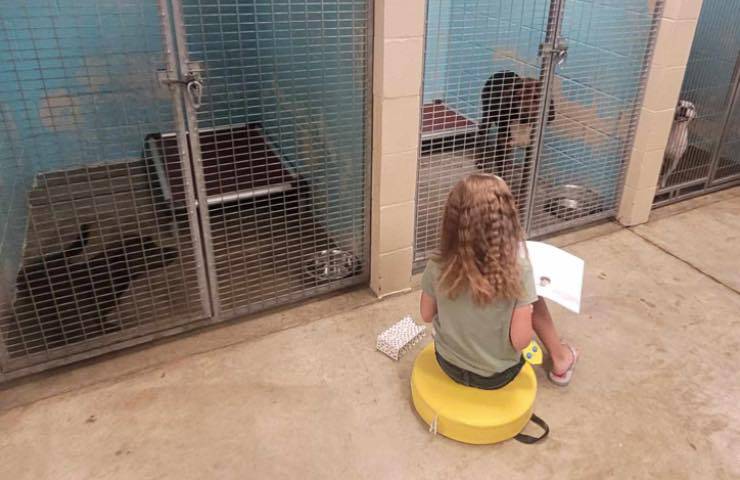 Giovani studenti leggono storie ai numerosi cani rimasti da soli nel rifugio d’estate
