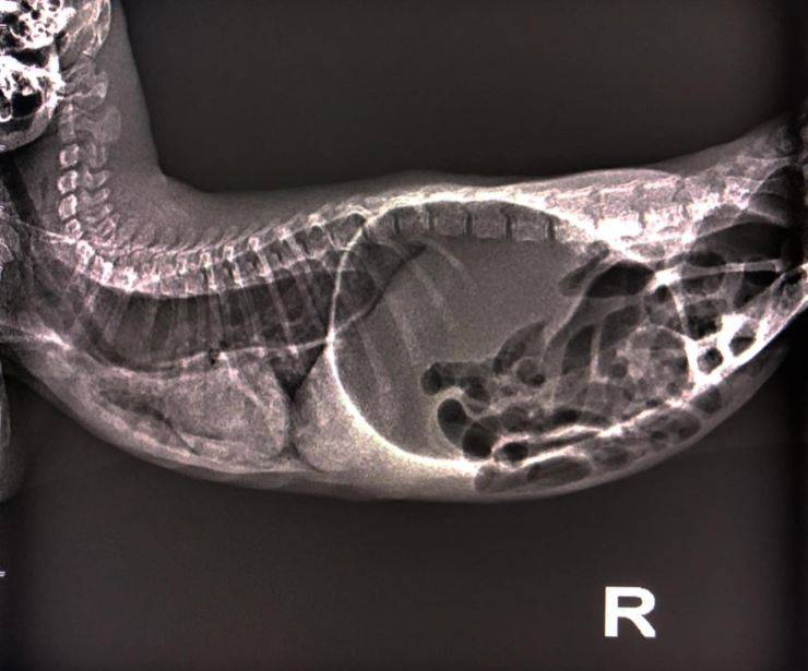 I medici veterinari che l’hanno visitata hanno subito notato uno stato di ipotermia e ipoglicemia e hanno dunque deciso di svolgere subito degli esami più specifici. Dallo studio radiografico è emerso che durante i tentativi di uscire dal water il felino aveva ingerito molta acqua e molta aria e che dunque vi erano i segnali evidenti di megaesofago e polmonite ab ingentis.