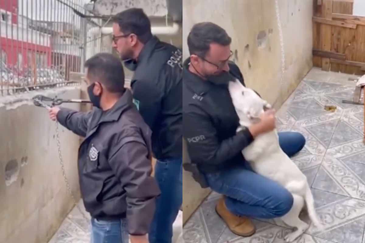 Non appena le catene che privavano il cucciolo della sua libertà sono state distrutte dalla coppia di agenti il Pit bull ha iniziato a mostrare loro la sua gratitudine, facendo le feste, rifugiandosi nell’abbraccio di uno dei due uomini e riempiendo il viso di quest’ultimo di baci. Una reazione definita come estremamente commovente dagli utenti sulla piattaforma.