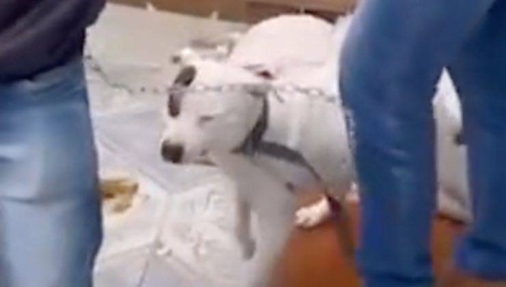 Il Pit bull dal manto bianco ha una graziosa macchia di colore marrone scuro sull’occhio destro. Il fido lamentava da diversi giorni uno stato di crudele abbandono. Secondo la ricostruzione degli agenti e le immagini condivise sui social il Pit bull si trovava in un ristretto spazio antistante all’abitazione di colui che avrebbe dovuto prendersi cura di lui fino a quel momento. Quando gli agenti hanno assistito, da vicino, oltre le sbarre dell’angusto cortile, alla disperazione del pelosetto hanno immediatamente deciso distruggere le catene che impedivano il loro ingresso e di fare irruzione nella proprietà privata.