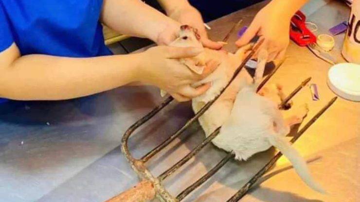 Il ladro ha ha ferito Pinky con le punte dell’attrezzo, le quali hanno perforato diverse zone del suo piccolo corpo, compreso l’addome, la zampa, la schiena e i testicoli. Il cucciolo ha affrontato un’operazione durata oltre due ore e mezza ed è stata abbastanza complicata visto che si doveva tirare via l’attrezzo in modo delicato.