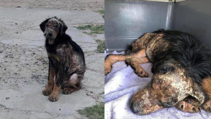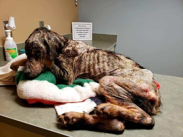 Il povero quattro zampe era affetto da demodicosi e da altre infezioni della pelle.