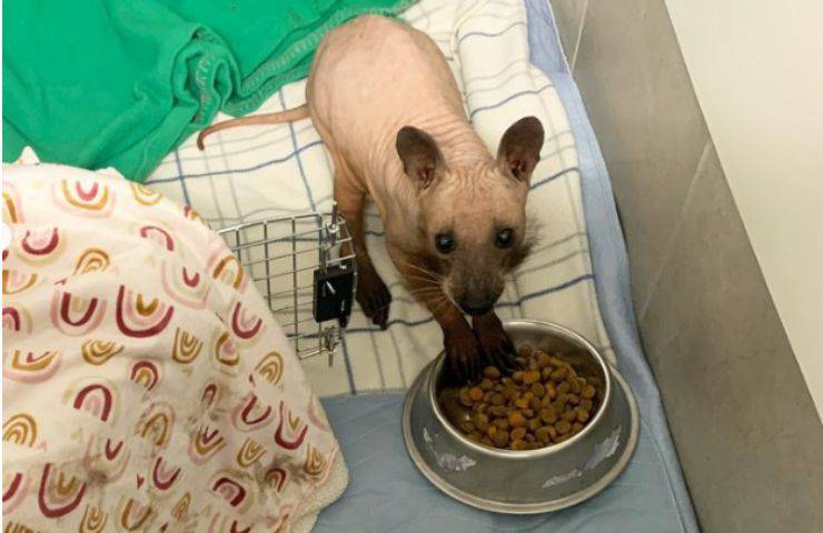 Ma come ha fatto questo misterioso animale a celare la sua vera identità? In realtà la povera creatura non ha fatto nulla per sembrare un micio, e neppure per essere identificato in modo specifico con uno Sphynx, la razza felina assolutamente riconoscibile grazie a una caratteristica: la totale assenza di pelo. E poi mangiava il cibo per gatti, messo a disposizione dalla coppia americana che lo ha trovato nudo e affamato.