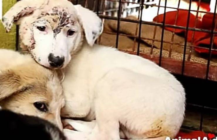 Un cucciolo di colore bianco è stato trovato in condizioni pessime mentre ricoperto di sangue tremava dalla paura per essere stato picchiato brutalmente.