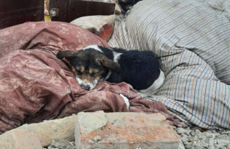 Ucraina: commuovono il mondo le immagini strazianti di un cane raggomitolato sul letto dei suoi umani appena morti in un bombardamento.