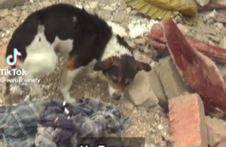 Raid missilistico in Ucraina: le immagini strazianti del cane che attende i suoi umani deceduti nel bombardamento (Video)
