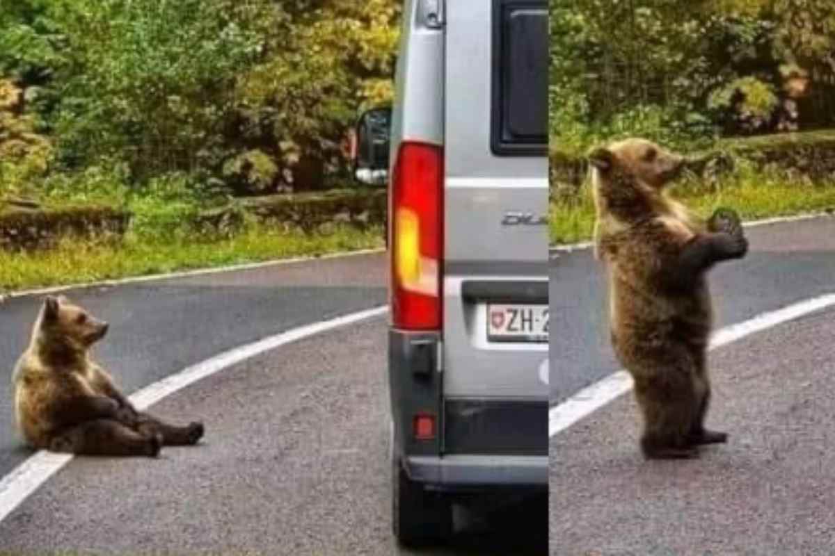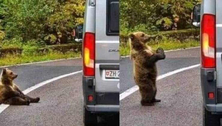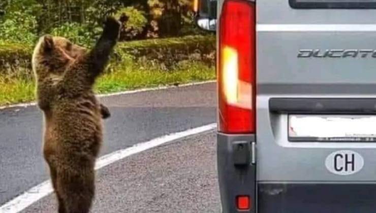 Tre scatti fotografici, tre momenti, tre scene confluite in un unico racconto. Un orso seduto pigramente sul bordo della strada, lo stesso orso in piedi sulle zampe posteriori con la zampa anteriore sollevata e poi infine l’orso in piedi sulle zampe posteriori mentre osserva un automobilista dal finestrino di un furgoncino Fiat Ducato. Queste immagini, postate sui social network, hanno divertito e allo stesso tempo fatto riflettere migliaia di utenti del web. Disposte secondo un ordine preciso, le foto mostrerebbero la riconoscenza di un orso che, dopo aver ricevuto della frutta dal conducente di un veicolo, avrebbe “ringraziato” per il dono agitando la zampe come se stesse salutando.