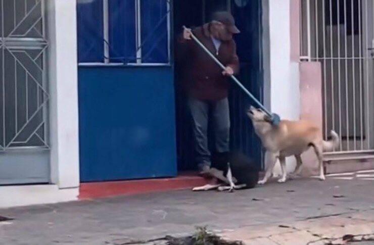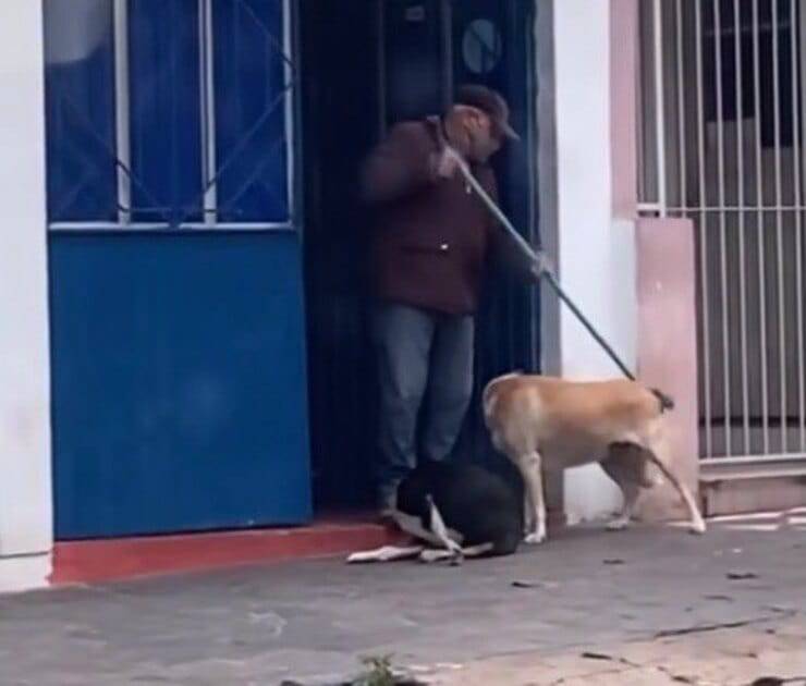 La scena ripresa è dolcissima. L’anziano signore con la scopa, gratta i due pelosetti che soddisfatti non hanno nessuna voglia di muoversi. Uno dei due, il cagnolone dal pelo chiaro, non soddisfatto delle poche coccole ricevute, con il musetto fa capire all’uomo che non ne ha ancora abbastanza. Così il signore lo accontenta e la gioia e soddisfazione nel cane è palese.