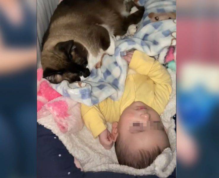 Inoltre, per tenere sotto controllo la situazione, il felino ha ben pensato di far compagnia al bebè nel suo tranquillo riposino.