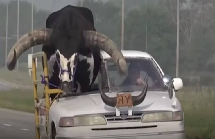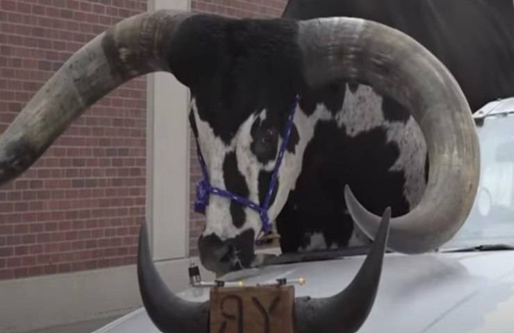 L’animale di nome Howdy Doody era enorme e le sue corna si estendevano molto oltre l’abitacolo, nonostante la situazione l’animale era tranquillo e pacato e non appariva affatto spaventato oltre a non manifestare segnali che facessero pensare ad un maltrattamento.