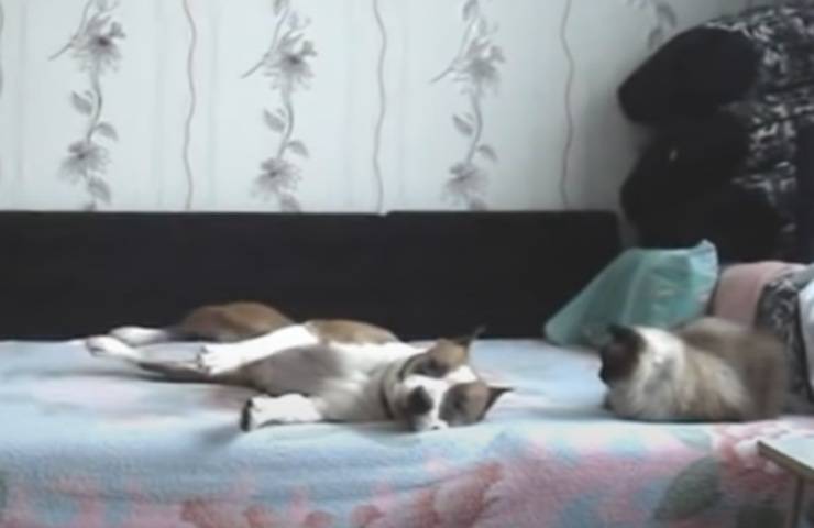 Il proprietario però, conoscendo il suo cucciolo e immaginando che questi non avrebbe obbedito, ha installato una telecamera nascosta per confermare i suoi sospetti. Il filmato, infatti, svela il comportamento messo in atto dal Pitbull non appena rimane solo a casa. La prima scena del video mostra il cane che osserva ubbidente il proprietario uscire dalla porta dell’appartamento. Non appena l’uomo si è allontanato, il cucciolo si dirige nella stanza accanto e si avvicina al divano letto sul quale giace appollaiata una gattina dal pelo lungo. Il Pitbull si ferma alcuni istanti a contemplare sia l’ambito luogo sia la micetta alla quale è concesso ciò che invece a lui è negato; cammina tranquillamente avanti e indietro e poi all’improvviso salta sul letto.
