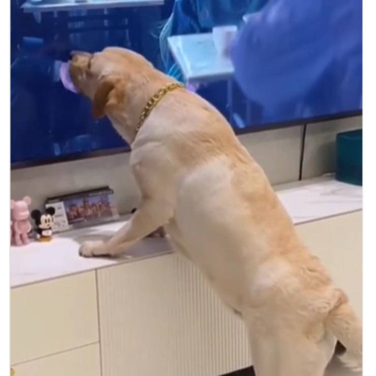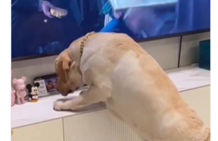 Uno degli attori protagonisti è seduto a un tavolo e sta mangiando; ad un certo punto prende l’hamburger e sposta la mano sotto al tavolo. Il Labrador, non comprendendo che quanto sta vedendo è solo un’immagine virtuale trasmessa da uno schermo, crede che l’attore gli stia offrendo il suo panino. Il cucciolo si alza quindi sulle zampe posteriori per avvicinarsi alla televisione e prova ad afferrare l’hamburger. Non riuscendoci, prova inizialmente a leccare lo schermo per poi accertarsi che il panino non sia caduto in terra. A quel punto la delusione del dolce cagnolino appare evidente: il Labrador si guarda attorno con un’espressione sconfortata. Sicuramente i suoi umani, avendo assistito alla scena, avranno ricompensato le aspettative del loro amico a quattro zampe con un panino reale.