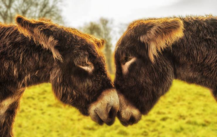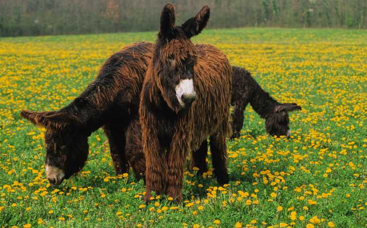 L’asino di Poitou è facilmente riconoscibile per il suo caratteristico mantello insolitamente lungo e marrone.