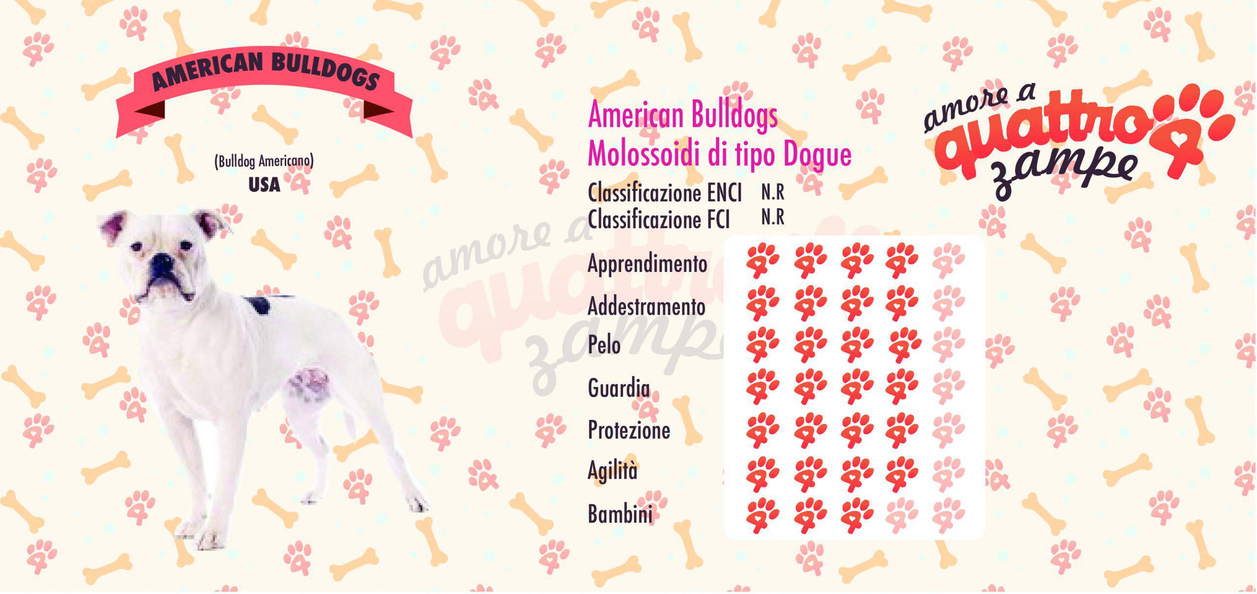 Il bulldog americano è una razza originaria degli Stati Uniti d’America, attualmente non riconosciuta dalla FCI, ma solo nel suo Paese d’origine. E’ un molossoide, di taglia grande con tanti muscoli e molto possente. Riesce ad adeguarsi a qualunque stile di vita, ma fa difficoltà a trovare l’intesa con qualsiasi padrone. Non è adatto, infatti ai novizi o gli anziani, che non riescono a gestirlo. Il padrone sportivo può aiutarlo poiché è un cane dinamico e con la voglia di fare esercizio fisico, ma si deve tener conto alla caratteristica del naso. D’aspetto imbronciato, ma è tenero quando si affeziona. E’ diffidente con gli estranei. Preferisce lavorare da adulto, anziché giocare con i bambini, però da cucciolo è un giocherellone. Sembra un cane da combattimento, ma non lo è mai stato. E’ perfetto come cane da guardia e riesce, con il tempo, a diventare un compagno perfetto di vita quotidiana.