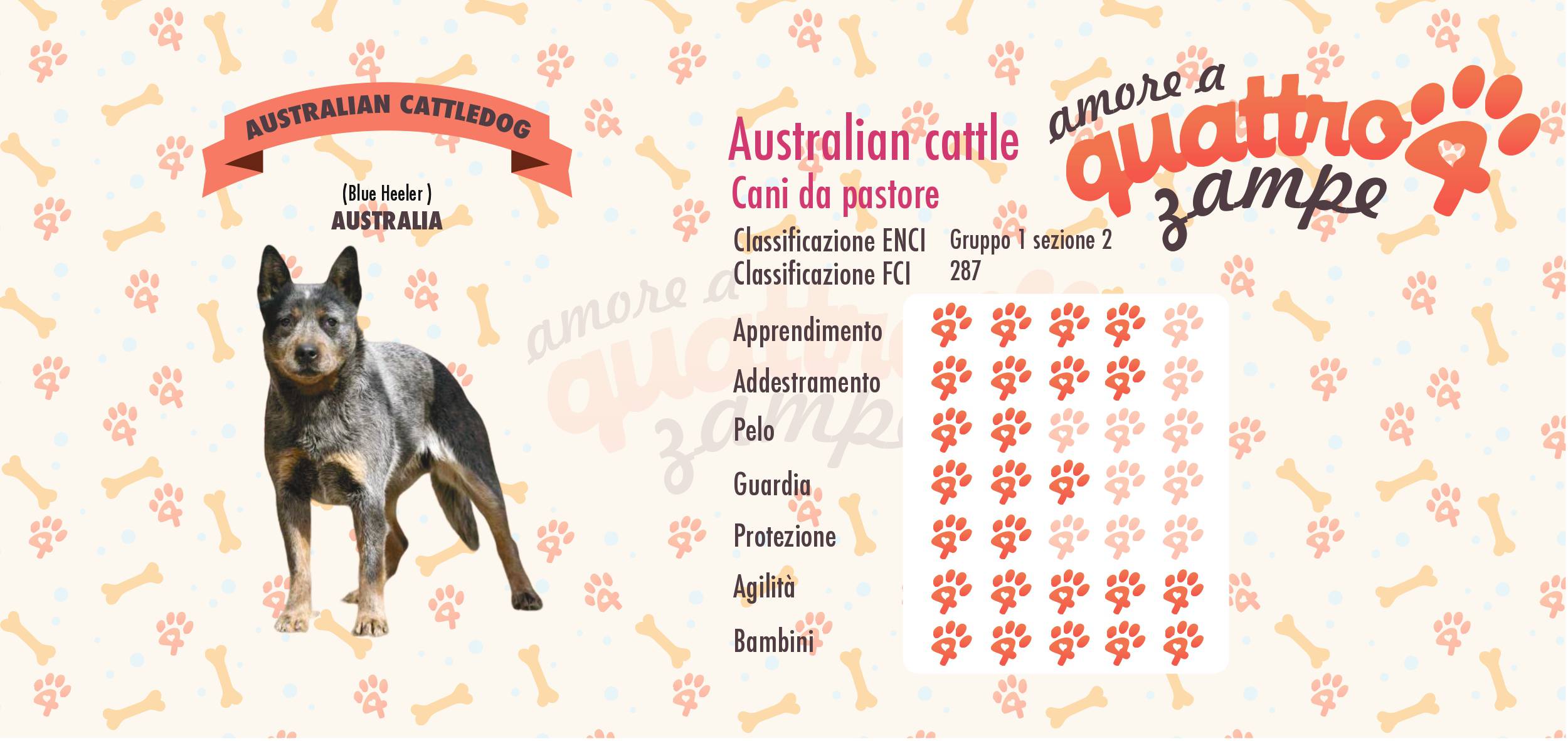 L’australian cattledog è una razza canina di origine australiana riconosciuta dalla FCI. E’ un eccellente cane da lavoro, molto considerato nel suo Paese dove è adibito, oltre che alla guardia delle fattorie. Come cane da mandria ha l’abitudine di attaccare i bovini ai talloni, e come guardiano ripete lo stesso gesto nel caso debba mordere l’uomo.