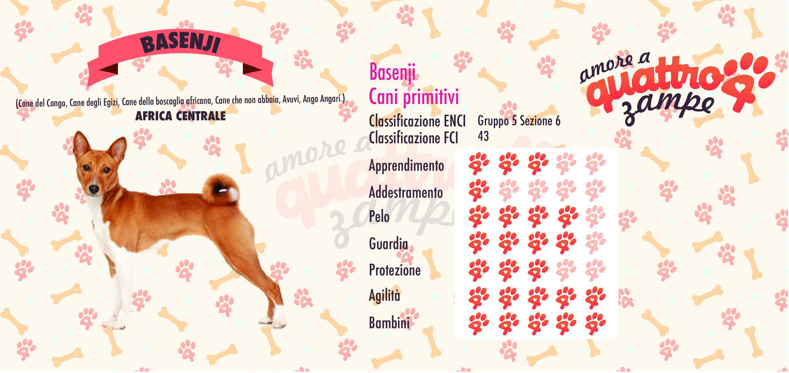 L’aspetto del Basenji con struttura fisica leggera, con un’ossatura molto fine. La particolarità delle femmine sta nel fatto che entrano in calore solo una volta all’anno.