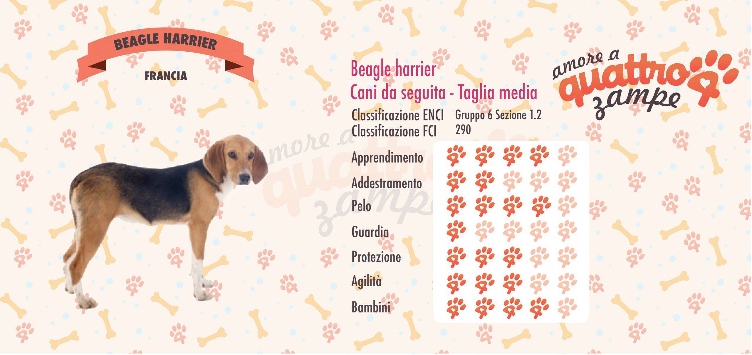 I Beagle Harrier nascono in Francia nel XIX secolo per l’astinenza del barone Gerard, e la sua caccia al cervo o alla lepre. Questa razza è un incrocio tra il Beagle e l’Harrier, ma all’inizio le cucciolatedi quest’incrocio non risultarono soddisfacenti, solo dopo qualche tempo si riuscirono a fissare i caratteri della nuova razza. È stato riconosciuto dalla FCI nel 1974. Oggi il Beagle-Harrier è in Francia ma non tanto in Italia.