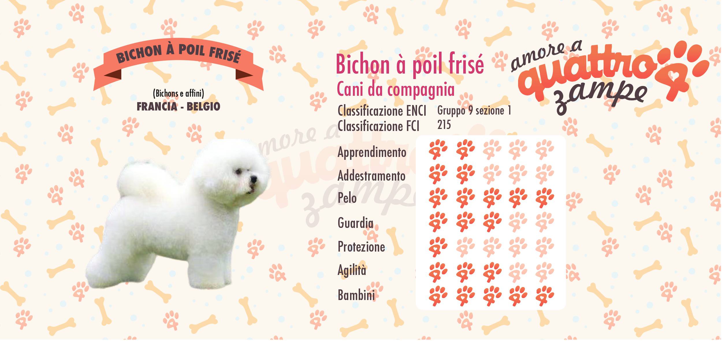 CARATTERE Un cane vivace, sempre di buon umore, mai aggressivo. Gli unici a non essergli troppo simpatici sono gli altri maschi, specie se di taglia molto superiore alla sua, con i quali è diffidente e, se viene provocato, può diventare rissoso, perché è molto coraggioso e non si preoccupa della differenza di mole; con gli altri cani piccoli va quasi sempre d’accordo. Ama i bambini e gioca volentieri con loro, ma è adatto anche alle persone anziane. Come tutti i Bichon ama il gioco e gli piace fare il “pagliaccio”: tra tutti sembra quello più portato allo “scherzo”, quasi possedesse un vero e proprio senso dell’umorismo.