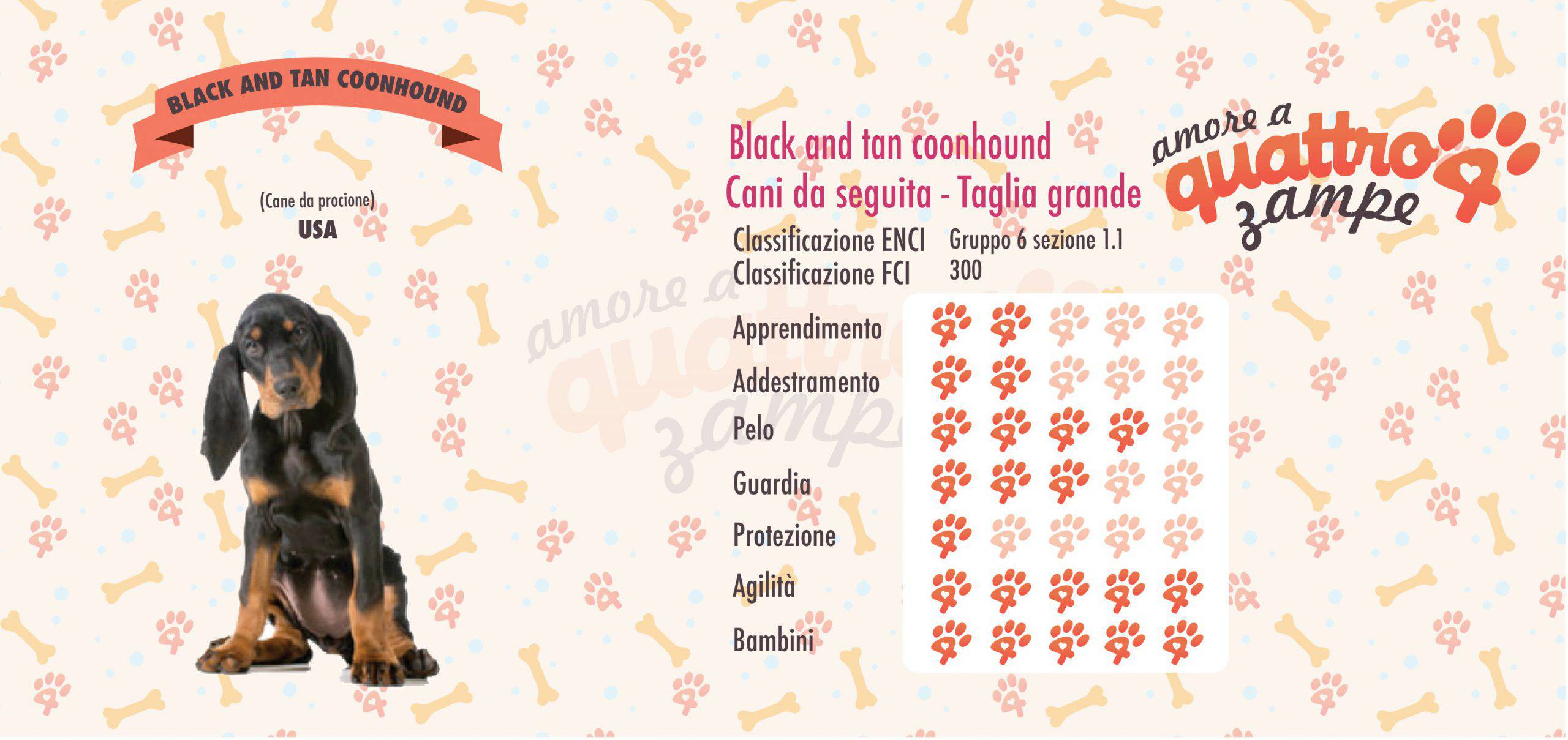 Il Black and Tan Coonhound ha uno stile di vita molto dinamico in quanto è un cane da lavoro, infatti ha bisogno di molto movimento. Nonostante la loro caparbietà nel lavoro sanno essere di ottima compagnia per tutta la famiglia.