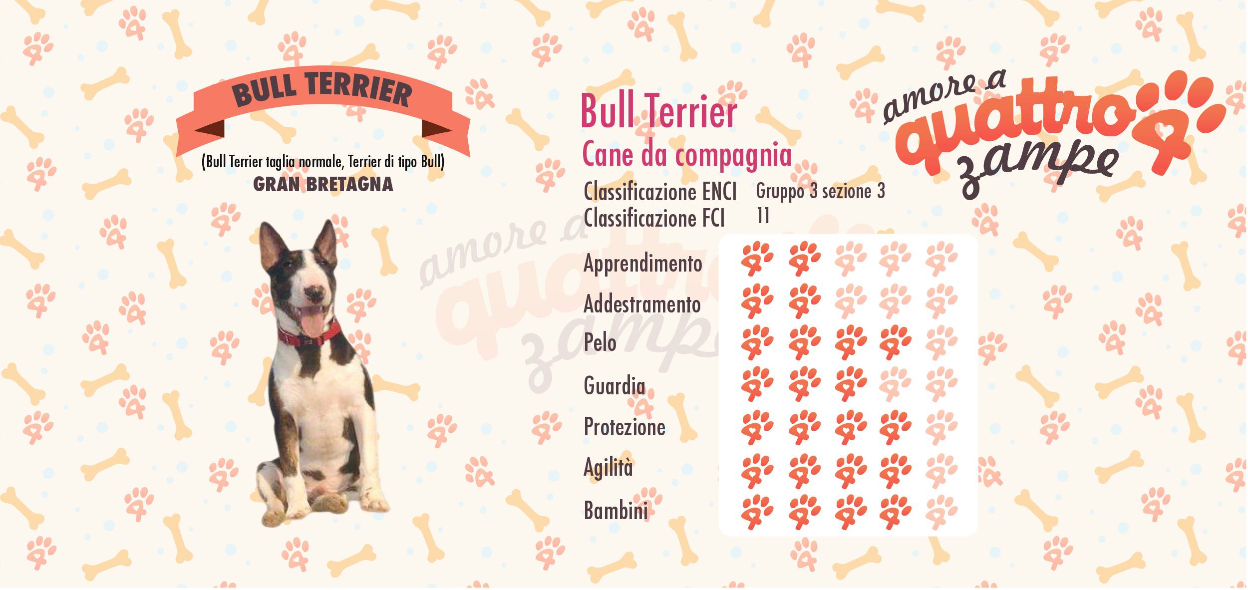 Il Bull terrier nasce in Gran Bretagna nel XIX secolo e viene riconosciuto come razza nel 1933. Discende dal “Bull and Terrier”, un formidabile cane da combattimento.