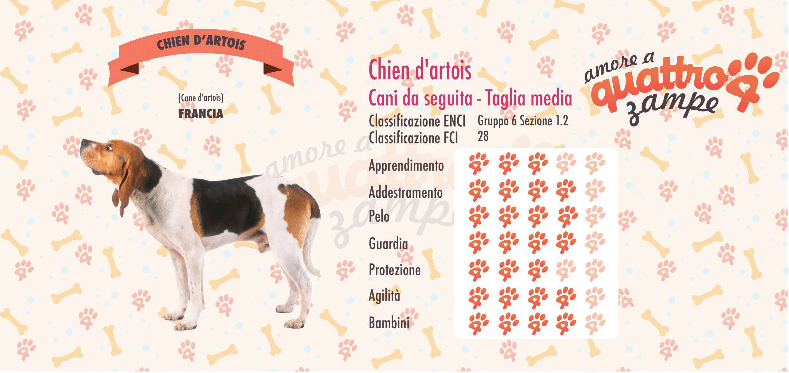 Il Chien d’artois alle sue origini chiamato anche Picard ha radici francesi e possiamo vederlo dal suo nome. Utilizzato da sempre per la caccia, che sia per grandi animali o la piccola selvaggina. Ha una struttura corporea perfetta per il suo lavoro e non risulta inappropriato. Il loro olfatto è impressionatane riescono a scovare le loro prede anche in posti inaspettati. Può svolgere il suo lavoro su qualsiasi terreno, che sia in pianura, in boschi o boschetti. Non è adatto come cane da compagnia, ma è perfetto per un compagno da lavoro. Si adatta alla famiglia e alla vita quotidiana, ma è difficile farlo abituare a vivere in città. E’ un cane pieno di energie, vispo, allegro e riesce a convivere con i bambini. Deve avere dei padroni che lo tengono attivo e sempre in movimento facendolo correre in spazi grandi. Con gli estranei è molto diffidente ed è difficile che si fida subito, infatti per educarlo ci vuole un proprietario di pugno forte per farsi obbedire.