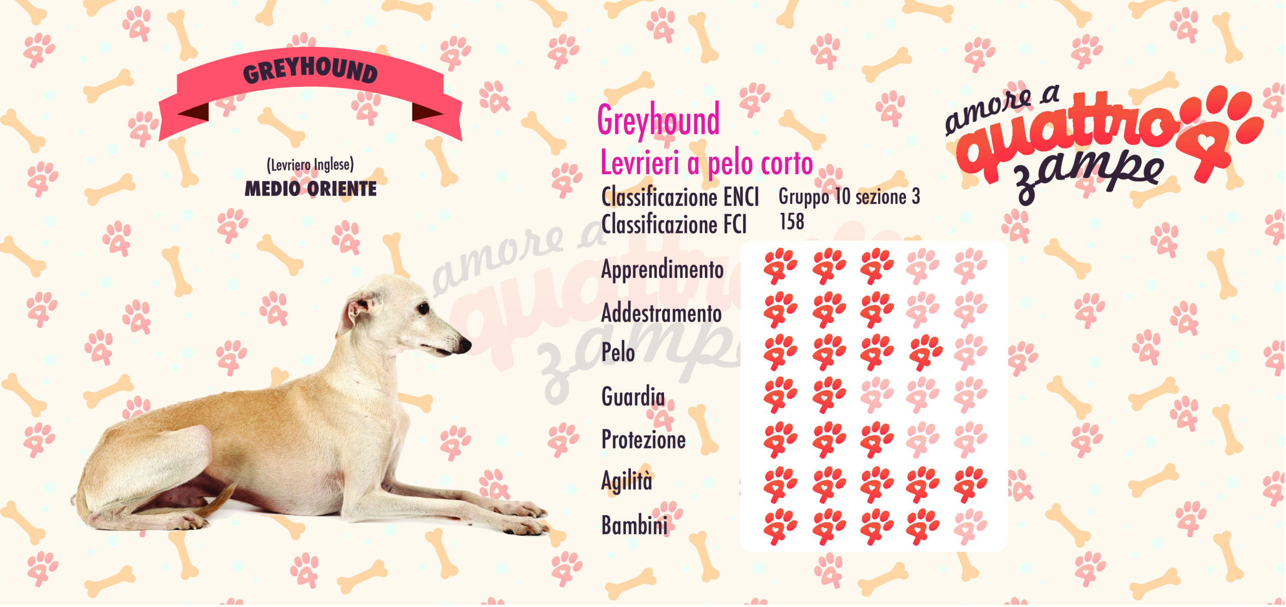 Il Greyhound o per meglio conosciuto come Levriero Inglese è un cane alto, snello, dall’aspetto regale molto fiero di se. Dal portamento raffinato e un mantello di una varietà di colori è un cane eccezionale. Tranquillo, leale e fedele, spesso può essere distante con gli estranei. Nati come cani da caccia oggi vengono usati come cani da compagnia. Si adatta ad ogni stile di vita che sia vivere in casa sul divano, in campagna all’aria aperta o in montagna tra i boschi, anche se qui è meglio evitare, perché dato il suo pelo, spesso ha dei brividi in inverno. Adora fare sport in quando è un cane eccellente nel correre infatti arriva anche a 70 km/h. Nel suo paese natio agli albori delle sue origini veniva usato come cane da caccia per il cervo, il cinghiale e il daino. Perspicace non solo nella vita quotidiana anche a lavoro.