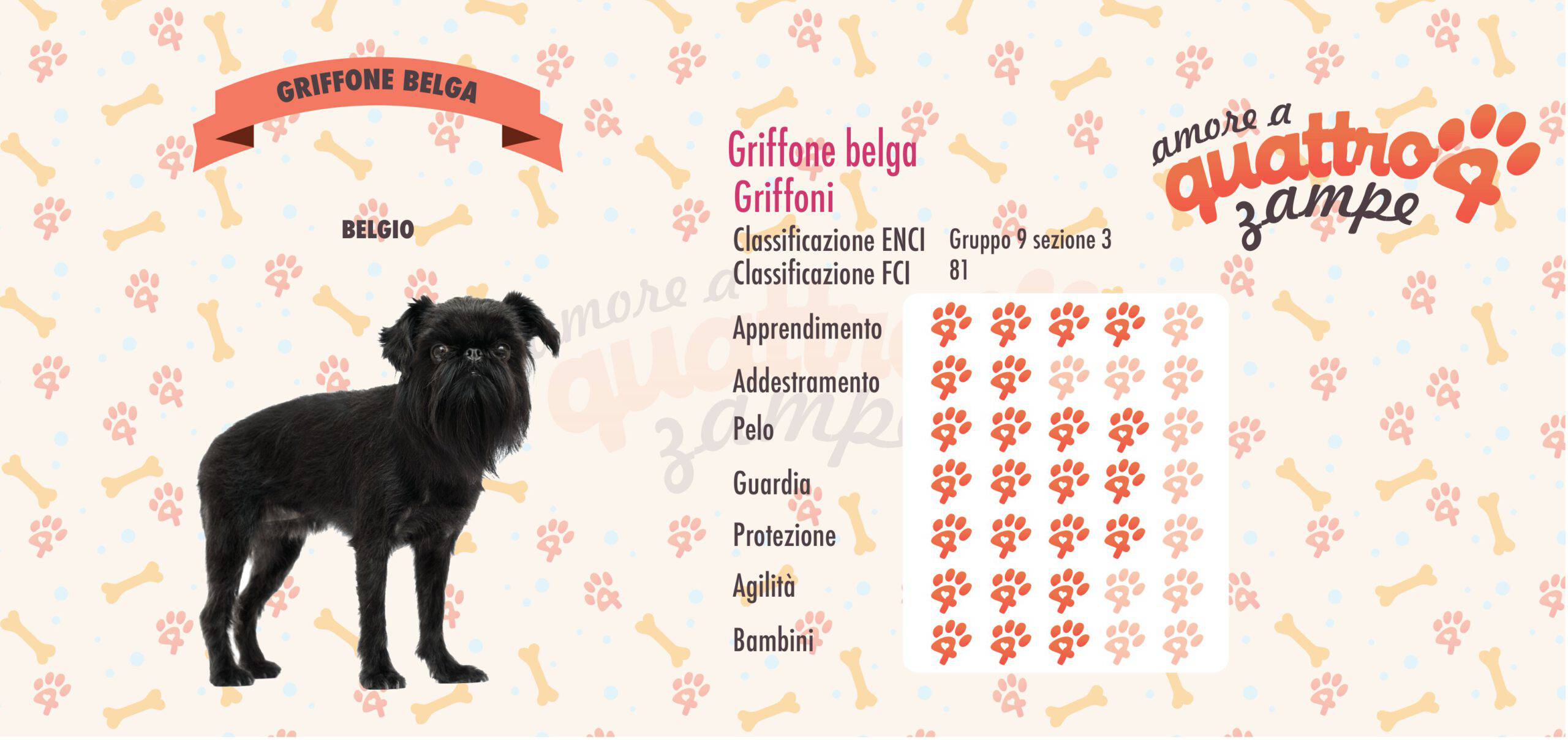 Il Griffone Belga fa parte del trio che derivano dal un cane dal pelo duro autoctono di Bruxelles. Gli altri due del trio sono il Griffone di Bruxelles e il Piccolo Brabantino. Il Griffone Belga è nato come cane da guardia ma poi grazie agli allevatori belgi e inglesi è diventato un ottimo cane da compagnia non perdendo le speciali doti da combattente. E’ un cane di piccola taglia, ma non da borsetta. Perfetto per la famiglia e adora giocare con i bambini. Un cane socievole, simpatico che mette allegria. Ha una struttura perfetta nonostante sia piccolo, non risulta goffo. La sua simpatia è dovuta anche al suo aspetto esteriore, in quanto ha baffi e barba proprio come un uomo. Sa abbaiare abbastanza se vede gli intrusi e quindi avverte il padrone, ma è coraggioso per proteggerlo. Può essere adottato dagli anziani e dai novizi poiché è obbediente e docile, non farà problemi per l’addestramento. Molto legato al padrone, anzi a volte risulta esagerato. Può vivere in appartamento e si deve incitare per fargli fare attività fisica. Non teme gli estranei, anzi è socievole e non diffidente.