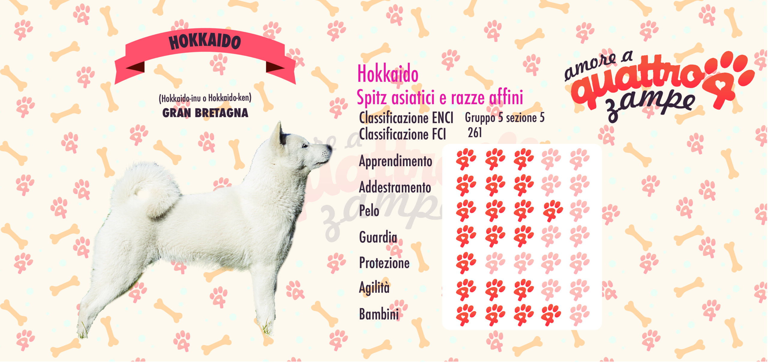 L’ Hokkaido chiamato anche Ainu-Ken è un cane di taglia media, robusto, molto proporzionato, con tanto pelo morbido e nella maggior parte dei casi ha un mantello bianco. Agile, attivo e molto intraprendente. Amante dei bambini, che tende sempre a proteggerli da qualsiasi cosa a costo della vita, e della famiglia. Un aspetto particolare di questa razza sono le labbra che tenono a salire verso le guance e questo permette al cane di avere un accenno di sorriso e quindi viene anche chiamato cane ‘sorriso’. Obbediente e fedele al padrone, ma ciò non toglie che ha un carattere testardo e ostinato. Si abitua con facilità a vivere da qualsiasi parte, ma sarebbe perfetto farlo stare all’aria aperta. Può sopportare climi rigidi, anche cadute di neve, ma non il caldo. Ama moltissimo viaggiare per il suo istinto da esploratore e ricercatore. E’ sempre stato usato come cane da caccia, ma da tempo è diventato un’esemplare per la compagnia. Non è adatto per gli inesperti. Ed è diffidente con gli estranei.