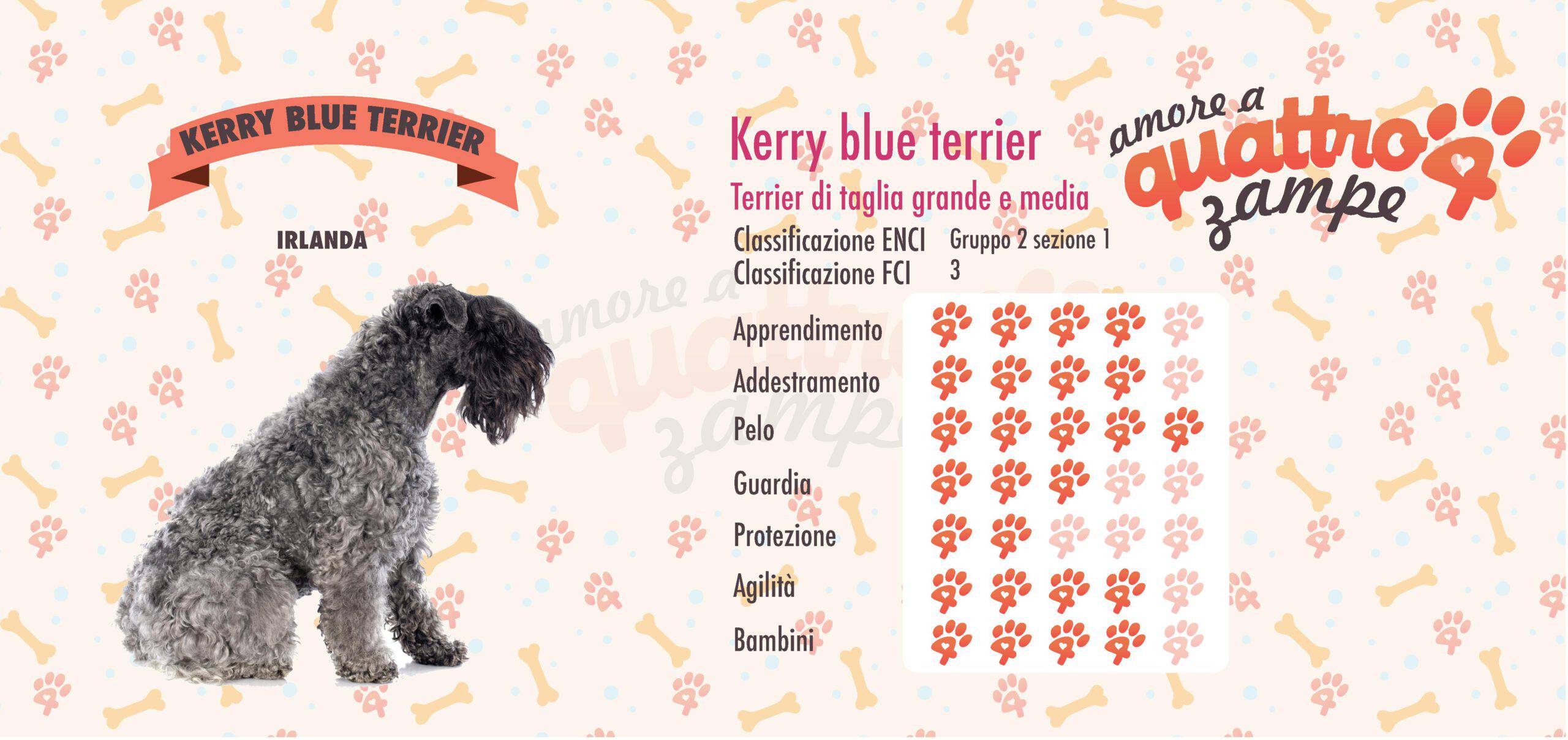 Il Kerry Blue Terrier o Irish Blue Terrier è un cane polivalente perché si presta a tante attività e riveste tanti ruoli: cane da compagnia, da caccia, da gregge, e guardiano. La sua taglia è di media grandezza, robusto, possente e con un aspetto insolito, infatti la caratteristica è la barba. E’ affettuoso, intelligente e valoroso. Viene anche usato per sfilate e concorsi di bellezza. In passato è stato usato anche come cane da combattimento per il suo forte coraggio. Adora la famiglia e può stare con i bambini. I suoi discendenti venivano usati per cacciare la lontra e animali selvatici. E’ un cane che si può gestire ed è mediamente facile da addestrare. I novizi devono sapere le caratteristiche del Terrier prima di acquistarlo. Eccelle nel suo lavoro da guardiano con un passato da guardino del gregge e del bestiame. Preferisce stare all’aria aperta ma si adatta anche negli appartamenti. In alcune zone dove si è diffuso viene anche usato come aiutante delle forze dell’ordine. Molto apprezzata e conosciuta come razza ai giorni nostri. Nonostante sia un cane singolare non è diventato una moda tra i vip ma è un esemplare richiesto dai cinofili esperti.