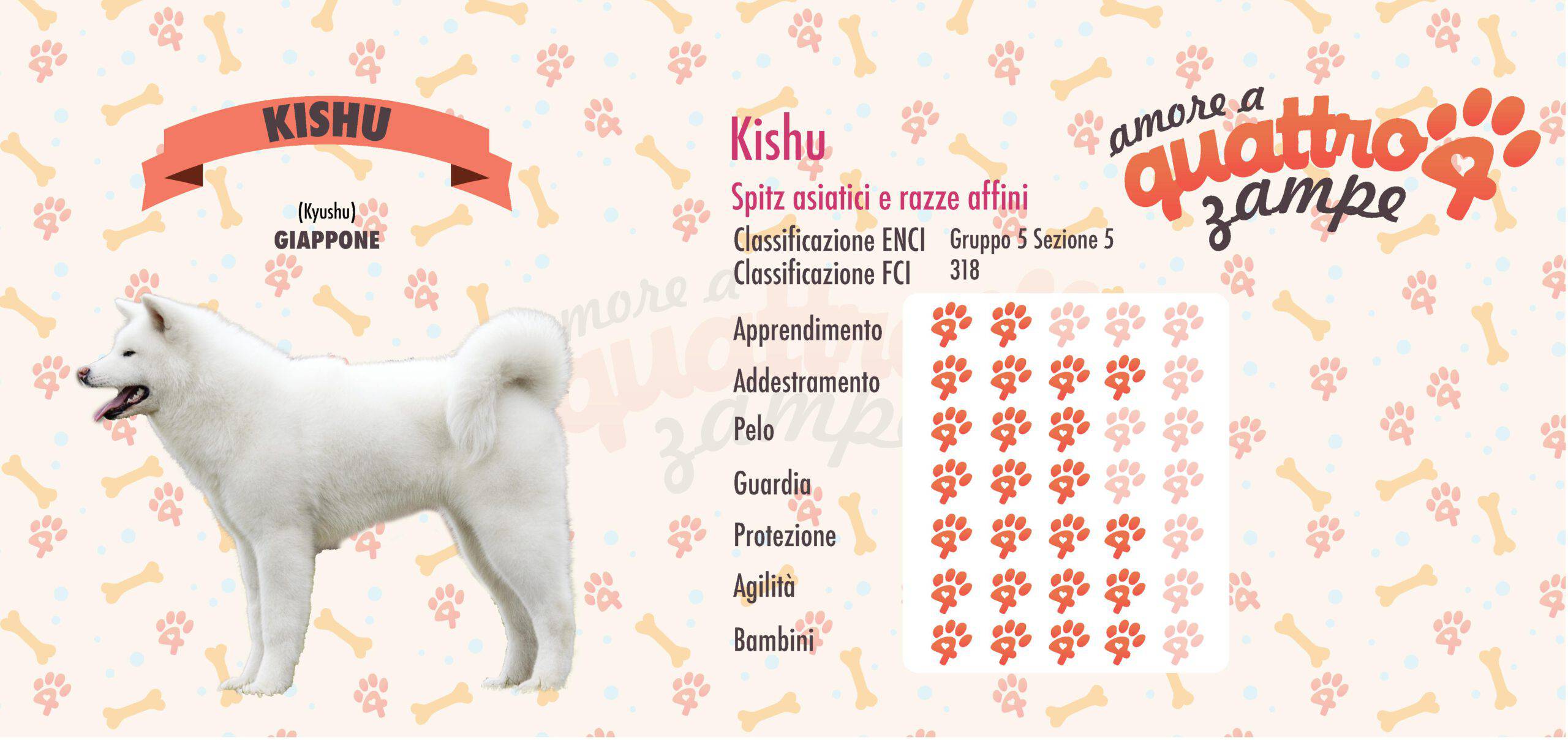 Il Kishu o chiamato anche Kishu Inu o Kishu dog è un cane con l’stinto innato da caccia ma con il tempo si adegua anche ad essere un perfetto compagno di vita domestica. Ha una statura media e proviene dalle razze autoctone del Giappone. Fedele al padrone e alla famiglia, può stare con i bambini ma devono rispettare i suoi spazi. Socievole e simpatico, infatti è facile da addestrare. La sua innata natura è con un temperamento indipendente. Gli piace la compagnia ma la solitudine non sarà un problema. È un buon cane da lavoro, riesce a portare le prede nella trappola. Riesce ad essere un discreto cane da guardia, ma si preferisce evitare di farlo stare in questa posizione. Molto attivo e attento gli fanno bene dei giochi ludici e interattivi. Vuole competere con tutti i suoi simili dato il suo forte carattere. Questo lo rende un cane dalla grande resistenza. Riesce ad adeguarsi a qualsiasi stile di vita dall’appartamento alla campagna. Vuole andare spesso fuori all’aria aperta negli spazi verdi per sfogare se stesso e la sua energia.