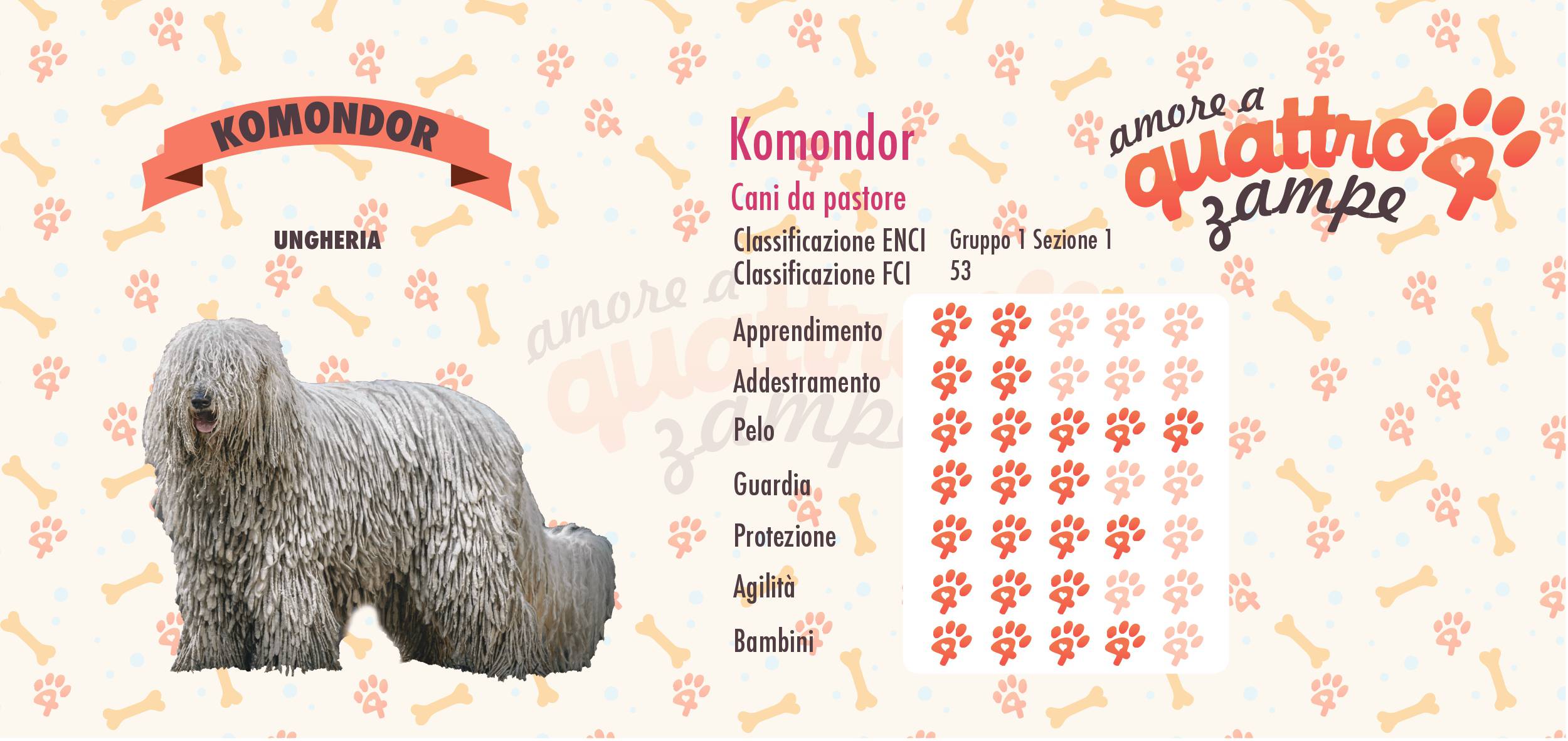 La provenienza di questa razza la possiamo accostare all’Asia ed è giunta in Ungheria nella prima metà del XIII secolo. Da questo Paese tramite i Cumani, un gruppo di nomadi stanziati in Ungheria, arrivarono in Europa. Questo popolo dedicava le sue giornate all’allevamento del bestiame. Gli antenati sono i cani originari del Tibet. Qualche documento del 1500 attesta che questi cani venivano definiti come i migliori aiutanti dei pastori. Quest’ultimi li adottavano per seguire il loro gregge ma con il tempo hanno continuato la loro selezione per mantenere un guardiano sempre vigile e attivo. La città natale è la loro ‘patria di elezione’. Nel 1920 venne ufficializzato lo standard del Komondor. Qualche anno dopo nel 1954 la FCI ha riconosciuto la razza. E’ molto famoso nel suo Paese è stato diffuso ed è apprezzato anche negli Stati Uniti.