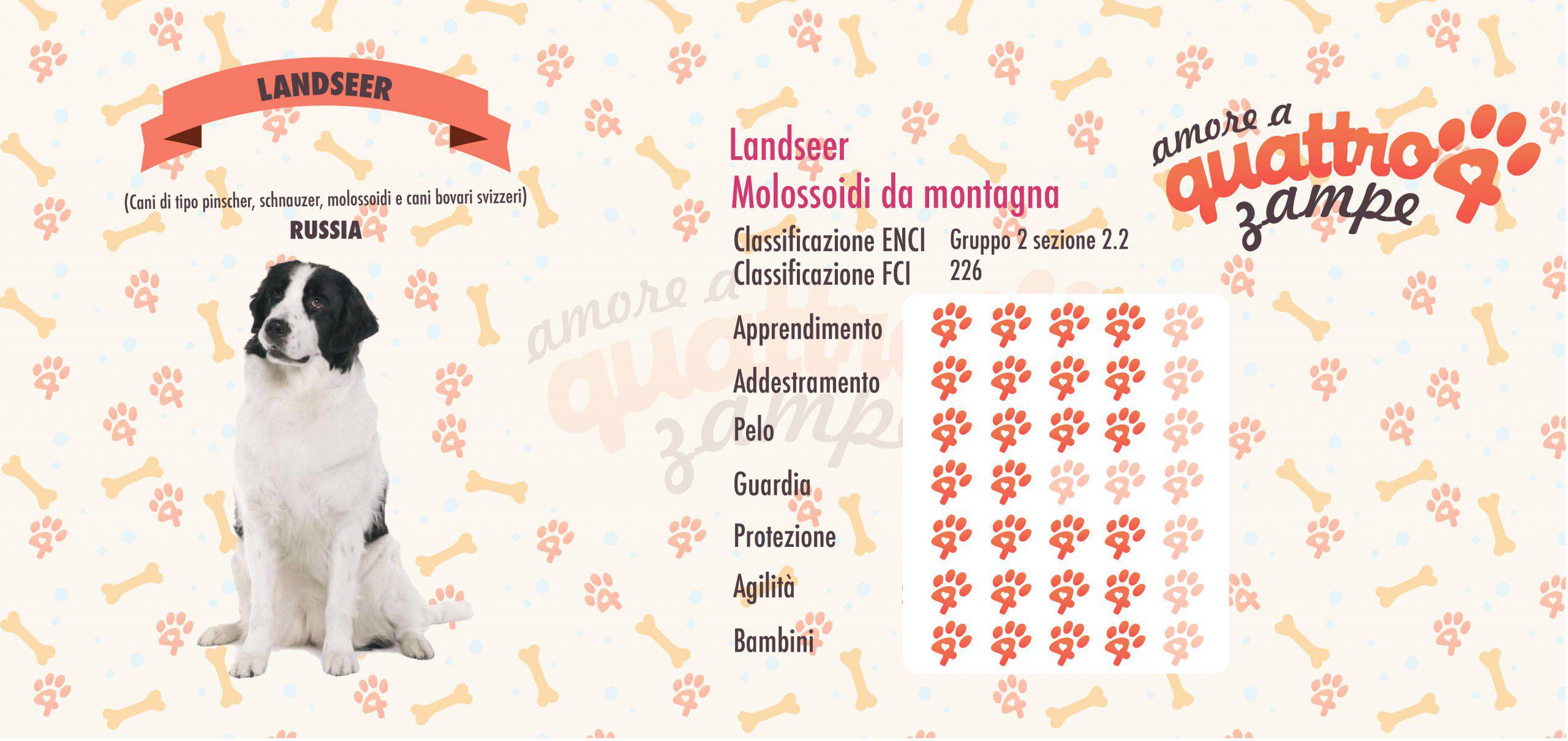 Il Landseer lo possiamo confondere con con un per il suo carattere. Il nome gli è stato dato al pittore Edwin Landseer, che lo ritraeva nei suoi quadri. Adora l’acqua e le passeggiate nei boschi.