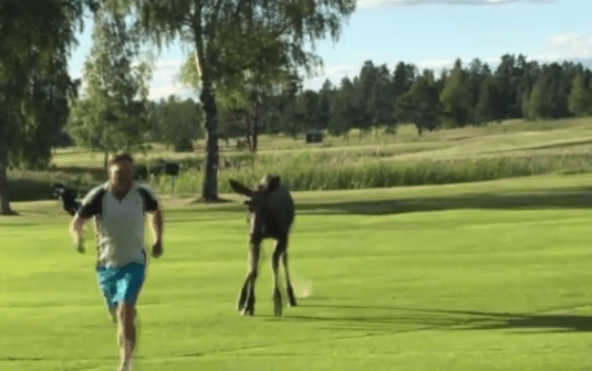 Insolita disavventura quella capitata ad un uomo a Karlastad, in Svezia. Il nostro si stava dilettando tranquillamente su di un campo da golf, accompagnato da alcuni amici. All’improvviso sul green arriva un grosso esemplare di alce, che sulle prime sembra non avere intenti bellicosi. Difatti il contatto tra il golfista e l’animale non pare essere affatto traumatico, ma i propositi pacifici vengono interrotti ben presto, quando il nostro amico si dà alla fuga precipitosa inseguito dal grosso animale. L’alce annusa la sacca dove sono riposte le diverse, costosissime mazze (d’altronde si sa che il golf è uno sport d’elité, che in pochi si possono permettere di svolgere con regolarità), all’improvviso però ecco che l’alce comincia a caricare la persona, il tutto tra le risate dei suoi compagni fuori campo nel video poi diffuso su internet e diventato virale. Per fortuna alla fine nessuno si è fatto male, e l’alce ha presto abbandonato il campo da golf per fare ritorno da dove era giunto.