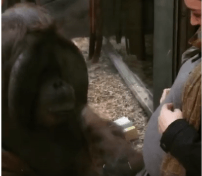 Siamo allo zoo di Colchester nel Regno Unito, dove un orangotango di nome Rajang, che appartiene ad una specie a rischio estinzione, è stato già protagonista di un video commovente nel luglio del 2015, quando si avvicinò al vetro che lo separa dai visitatori per baciare la pancia di una donna incinta che si era soffermata davanti al suo recinto.