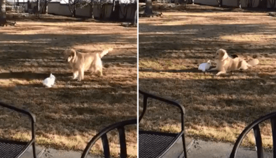 Si tratta di un breve filmato con protagonisti un simpatico coniglio tutto bianco e un golden retriever. I due esemplari sono all’esterno di un’abitazione, in un bellissimo giardino e danno vita ad una scena davvero indimenticabile. Questi due amici infatti iniziano a giocare all’impazzata e si può notare come anche tra due specie il gioco diventa comunicazioni ed eccitazioni. A turno, cane e coniglio s’invitano a giocare: dapprima il coniglio e poi il cane, in un’alternarsi del saltarsi addosso, dare una zampata e corrersi appresso.
