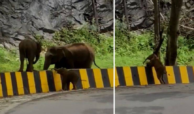 Cucciolo di elefante attraversa la strada e trova un ostacolo. La madre insegna al piccolo come superare il guardrail