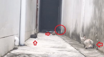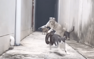 In questo caso, si vede un gatto intrappolato in un corridoio, di fronte ad altri gatti che sembrano piuttosto nervosi. Lungo il corridoio da una parte e l’altra si possono notare tre gatti accucciati, in una posizione che lascia intendere che sono pronti ad attaccare. Il movimento nervoso della coda, la posizione da predatori sono espliciti in tal senso. La vittima, un tenero gatto bianco e nero, cerca di uscire fuori da questa situazione.